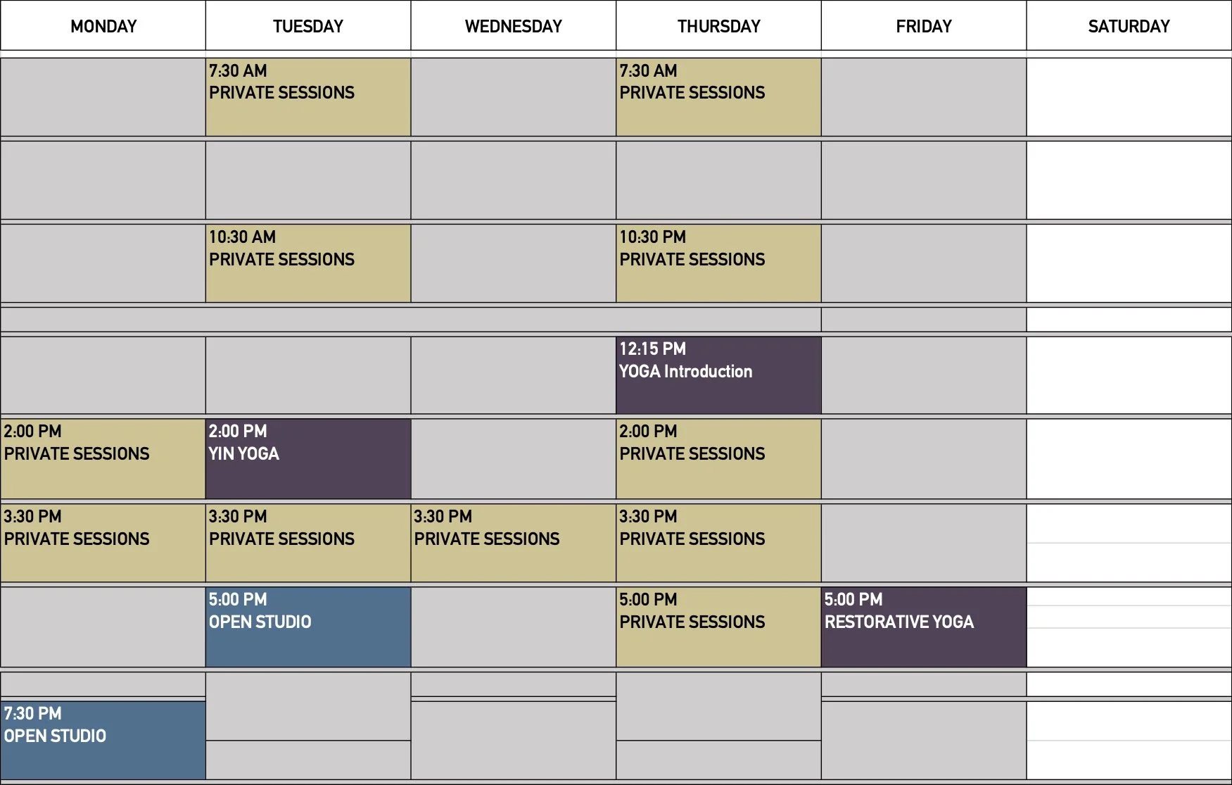 Nur nach Terminvereinbarung. Die aufgeführten PRIVATE SESSIONS sind für Yoga und Pilates Private Gruppen, Coaching, Einzel-oder Tandem-Pilates Training verfügbar. Graue Felder sind nicht verfügbar.